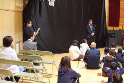5日午後、文化庁の「文化芸術による子供の育成事業(巡回公演事業)」の劇鑑賞会がありました。来賓の稲嶺平野区長をはじめ学校協議会メンバーの方々を招待し、全校児童と共に楽しいひと時を過ごしました。