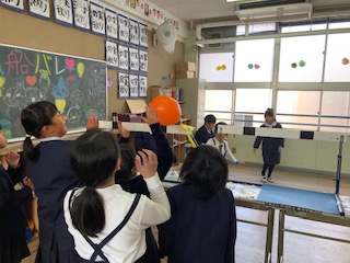 5年生はチームでラリーの回数を競う「風船バレー」、相手と対戦をするタイプの「風船バレー、しゅりけんで的を狙う「しゅりけんまと当て」をしています。