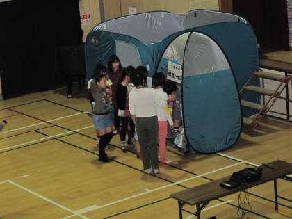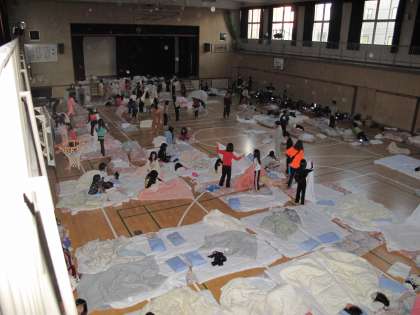 新平野西地域活動協議会の青少年部会主催の子ども一泊防災研修会が今年も行われました。4〜6年の児童107名が参加し、講堂での宿泊を体験しました。区役所による防災についての学習会をはじめ、リクレーションや肝試しなどを楽しみました。