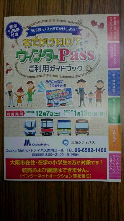 「おでかけKIDSウィンターパス」ご利用ガイドブックを配布します。予備がありませんので、紛失しないようにお願いします。また、「おでかけKIDSウィンターパス引き換えについて」の手紙も合わせてご確認ください。