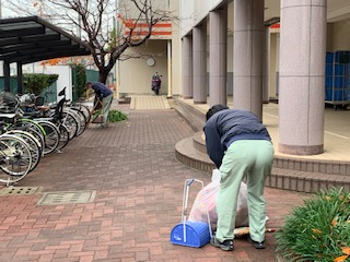 管理作業員さんは、朝早くから玄関をそうじしたりしています。つい先日までは、桜の木からたくさんの落ち葉が落ち、朝だけでなく、昼もそうじをしていました。