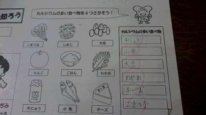 栄養教諭の先生に来ていただき、「カルシウム」について学習しました。ワークシートを使って、カルシウムが多く含まれている食品にはどんなものがあるのかを教えていただきました。