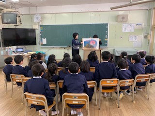 「おはなしたからばこ」のみなさんから大型絵本を読んでくださり、みんな真剣に聞き入っていました。