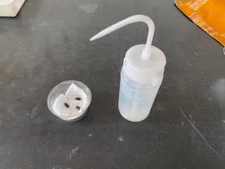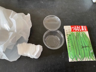 写真のようにふた付きの透明なカップ、保水のためのだっしめん、ツルナシインゲンの種を準備します。