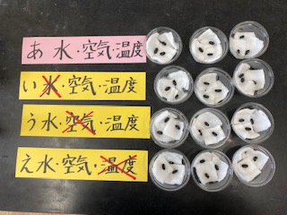 水、空気、適当な温度がそろっている場合と、それぞれ一つがない場合を調べるために、カップを12個用意しました。これは、できるだけ実験の確からしさを高めるための工夫です。