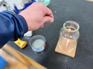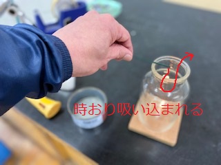 空気の流れを見るために、線香のけむりを穴に近づけてみます。