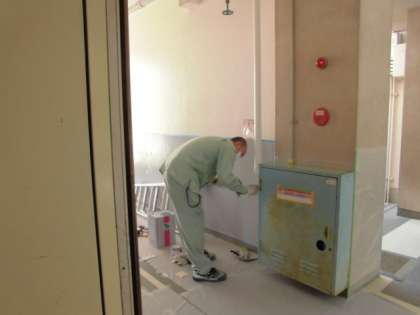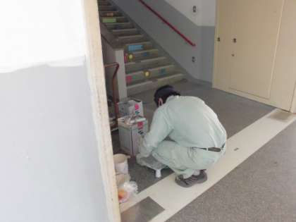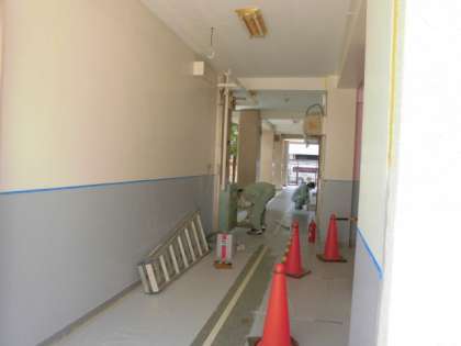 最後に、管理作業員さんが学校の壁を順番にきれいにしてくれています。今日は、一階のトイレ付近でした。はじめにはがれたペンキをとります。次に、表面の凸凹を、シーラーという壁用の建材で、平らにします。そのあと仕上げでペンキを塗っていきます。でも塗る前の養生(ようじょう)作業が大変です。ペンキが飛び散っても困らないように、まわりをシートでおおう作業です。ペンキ塗りの成功の秘訣は、この養生作業にかかっています。二人のおかげで、学校はとてもきれいになってきています。君たちが学校に戻ってくることを楽しみにして、作業してくださっています。きれいになった学校で早く過ごせるといいですね。