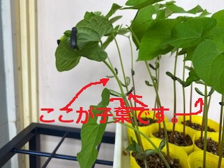 一番上の写真では発芽した後の子葉の部分を示しています。緑色でずいぶんひなびた形をしていますね。この後、子葉はもっと小さくなって、最後には地面に落ちてしまいます。