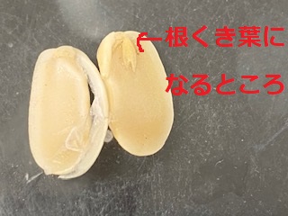 真ん中の写真は、種子のようすです。縦に二つに切り分けると、根や茎(くき)になる部分と子葉とが分かります。