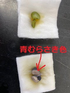 もともと種子の子葉を横に切って、そこにヨウ素液をかけたものと、発芽した後の緑色になった子葉にヨウ素液をかけたものが、一番下の写真です。