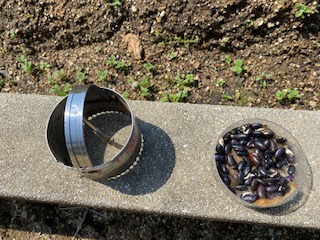 一番上の写真は芽の出た種(まいた 残りです)とマルチにあなを開ける道具です。