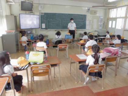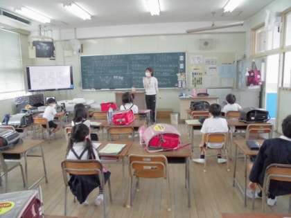 教室で、のあいさつの後、自己紹介や手紙についての話をしっかり聞きました。
