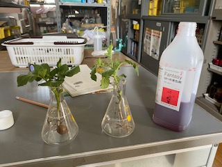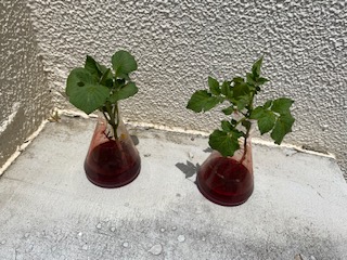 根の部分が染色液にひたるようにして、日当たりのよい場所に置いておきます。