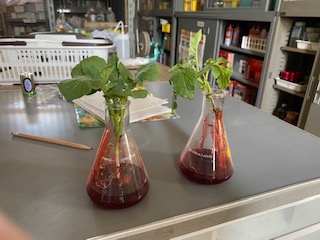 赤い液体は、生け花用の染色液(せんしょくえき)です。