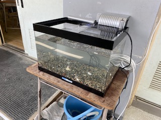 下の写真は、1組と2組の間に設置(せっち)したメダカの水槽です。