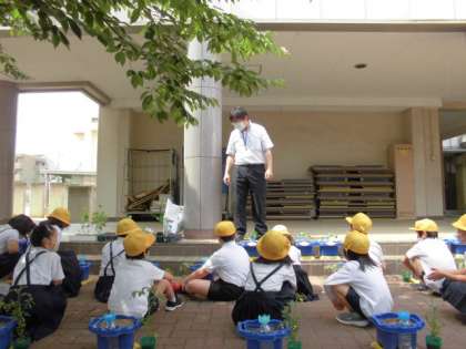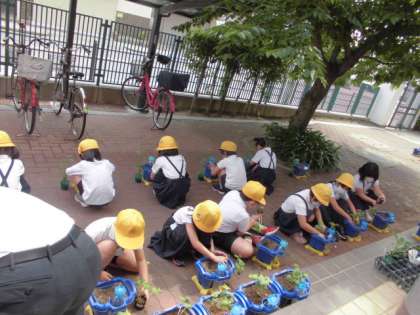 ピーマン、ミニトマト、ナス、オクラなど、自分で申し込んだ苗を植木鉢に植えました。