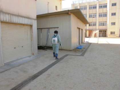 重いタンクを背負っての作業ですが、子どもたちのためにと頑張ってくれました。