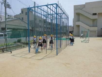 遊具で一輪車に取り組んでいる子どもたち。