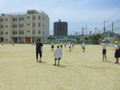 運動場でドッジボールをする子ども。