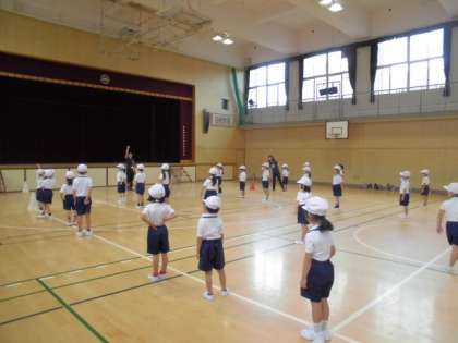 今日は講堂で体育をしました。