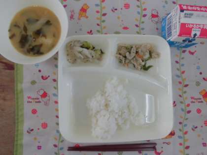 今日は、野菜を多く食べることができました。赤じそ和えは、赤いしそをを塩漬けした後乾燥させたものです。よく「ゆかり」と呼ばれています。