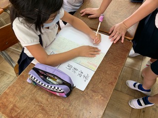 完成したグループに、どこを工夫したの?と尋ねたら、新聞のタイトル、わりつけと教えてくれました。