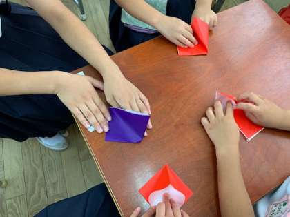 今日は、6年生2クラスが、1年生に折り鶴の折り方を教えに行きました。みんな真剣な表情で折り鶴を折っていました。
