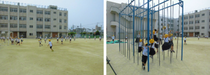休み時間には、元気いっぱい学校での生活を楽しんでいました。鬼ごっこ、ボールあて、遊具を使った遊びなどしっかり楽しんでいました。