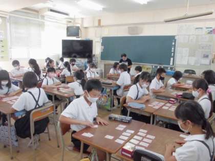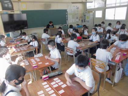 先生の読む声にあわせて、みんなでとり札をとっていました。