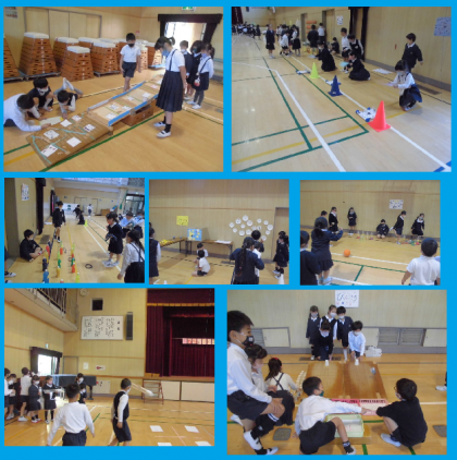 今日は講堂で、2年生が1年生を招待しての遊びフェスティバルでした。