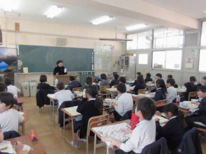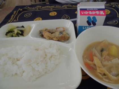 冬が旬のさばを使い、みんなが大好きなカレー味で仕上げました。みそ汁は、甘さが出るようにサツマイモを入れました。煮びたしは、彩りを考えて白菜を加えました。