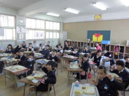 1年生もしっかりおかわりをしていただいていました。はじめの頃は給食を多くのこしていましたが、慣れてくるに従いたくさん食べるようになってきました。魚が大好き、肉が大好きなど好みは様々ですが、みんな大きく成長してきました。2年生になるのが楽しみです。