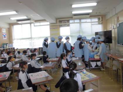 6年生が、1年生の教室に給食を運んで、配膳までしてもらっています。