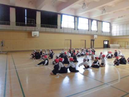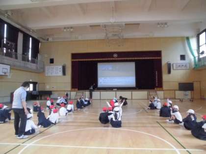 今日は講堂で、正しい運動場の使い方を教わりました。
