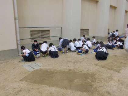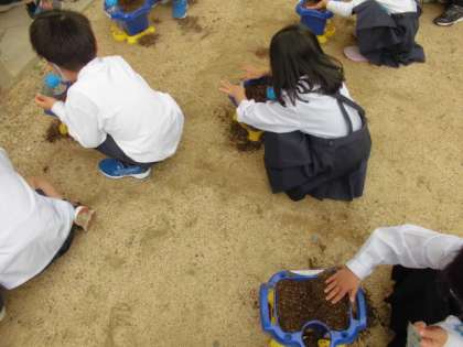 植木鉢に、土を入れ肥料をまき水をまきました。