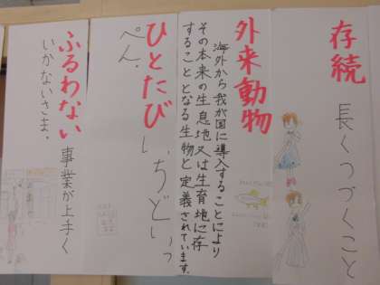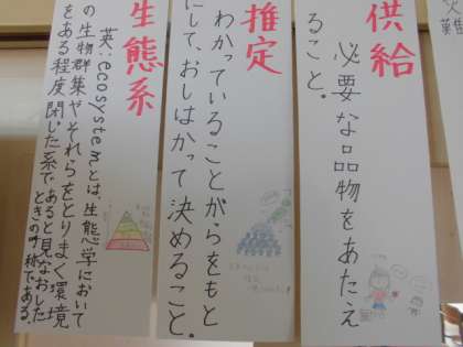 国語の学習で意味調べをします。普段ならノートに書いていくことが多いのですが、クラスのみんなと共有するため、短冊に書いてみんなでわかるようにしています。そのうえ、説明には絵もかいてありました。意味調べをした子は、絵をかくことでより一層理解が深まります。周りの児童も、絵を見てよく理解できるようになっていきます。