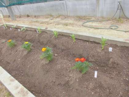 3年生も、自分の植木鉢にマリーゴールドやホウセンカを植えた後、学習園にもマリーゴールドやホウセンカ・ひまわりを植えました。