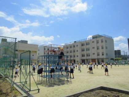 梅雨の晴れ間に、運動場で子どもたちが元気よく遊んでいました。