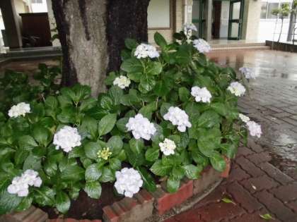 玄関にあるアジサイがきれいに花を咲かせています。