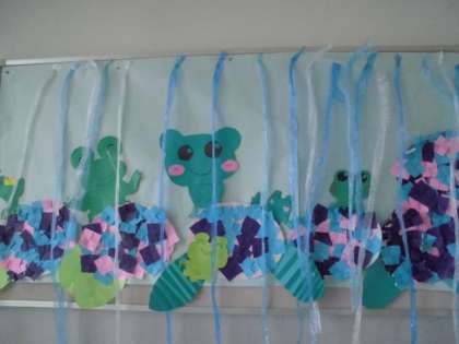 そう思って学校をまわっていると、4年生の廊下にもかわいいアジサイが雨の中に咲いていました。なんと、かえるまでいます。子どもたちの力作です。