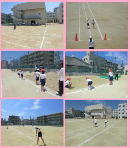 50m走、ソフトボール投げ、立ち幅跳びを運動場で行いました。
