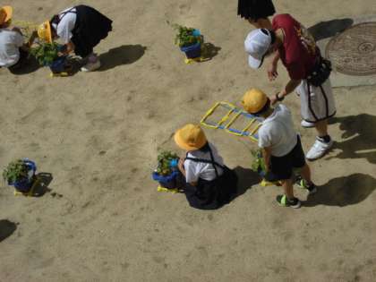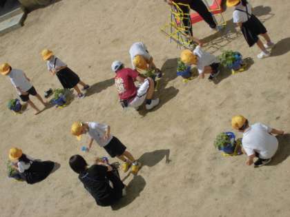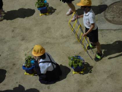 今日は、あさがをがしっかり伸びてきたので、支柱をつけました。