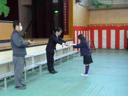 講堂にて修了式が行われました。全校児童を代表し、5年生の代表児童が校長先生より修了証をいただきました。全校児童はそれぞれの学年の全課程を修了し、いよいよひとつ上の学年に進級します。