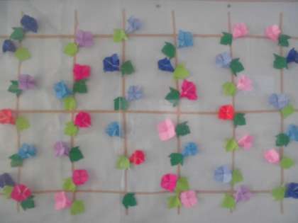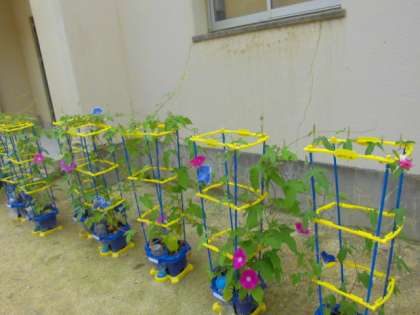 ふと掲示板を見るとたくさんの朝顔が涼しげに咲いているではありませんか。