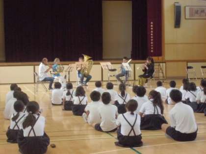 金管楽器の特徴を学習しました。トランペットは高い音、ホルンはやわらかい音。