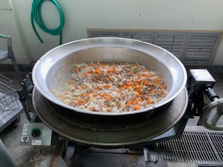 大きな鍋でみんなの給食を調理しています。