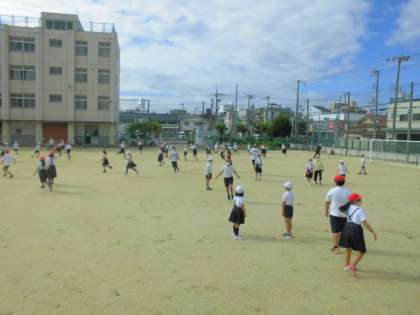運動場にいる先生と、集会委員会の児童が鬼役になりました。