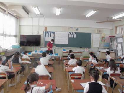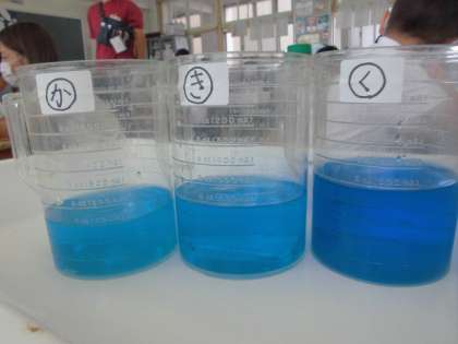 同じ大きさの入れ物に入れて、水の高さで比べていきました。