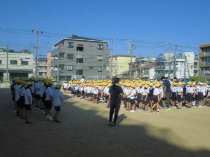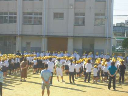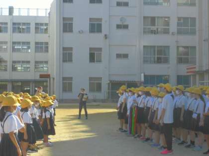 6年生から、修学旅行で納める千羽鶴を全校児童に紹介しました。