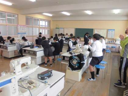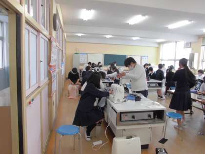 今日は、家庭科室で、ミシンを使ってエプロンを縫いました。
